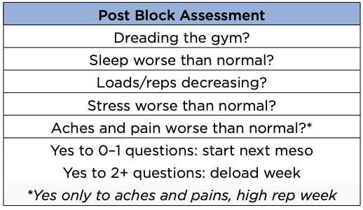 - Keep RPE at 6–8.5, avoid performing movements that cause soreness (new movements or those with heavy eccentrics at long muscle lengths, like RDLs).